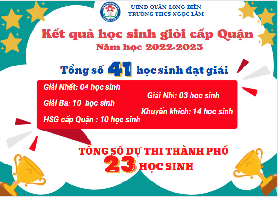 Với sự chỉ đạo sát sao của Ban giám hiệu, sự vào cuộc, trách nhiệm của các thầy cô giảng dạy và chủ nhiệm lớp, sự phối hợp, động viên của gia đình, sự nỗ lực, quyết tâm của các em học sinh trong kì thi học sinh giỏi cấp Quận, trường THCS Ngọc Lâm đã đạt được thành tích đáng tự hào: