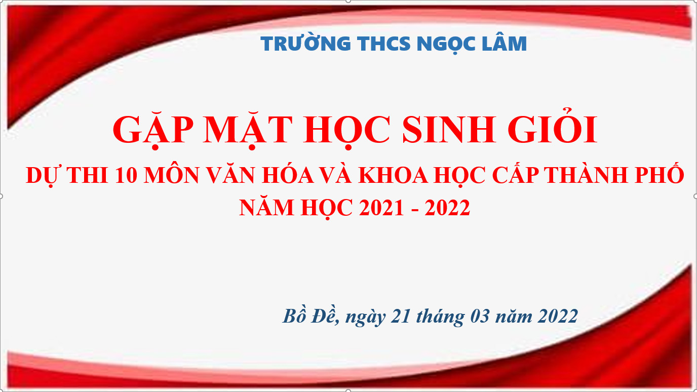 bản thân cũng như toàn bộ các bạn học sinh khác trong kì thi này. Kì thi học sinh giỏi cấp Thành phố được tổ chức hàng năm, là cơ hội để động viên, khuyến khích thầy và trò đổi mới phương pháp giảng dạy và học tập, phát huy năng lực sáng tạo, khả năng tự học. Bên cạnh đó, kì thi cũng góp phần quan trọng trong việc nâng cao chất lượng giáo dục và đào tạo mũi nhọn, phát hiện và tuyển chọn những học sinh có năng khiếu để bồi dưỡng, giúp các em có cơ hội phát triển hết khả năng của mình. Các em hãy quyết tâm tiếp bước các thế hệ học sinh giỏi đi trước, phấn đấu đạt thành tích cao nhất trong kì thi học sinh giỏi cấp Thành phố năm học 2021 -2022 và trở thành niềm tự hào của gia đình, bạn bè, thầy cô và cũng là tấm gương cho các thế hệ học sinh Trường THCS Ngọc Lâm quận Long Biên mai sau. Chúc các em học sinh tự tin, vững bước và thành công!