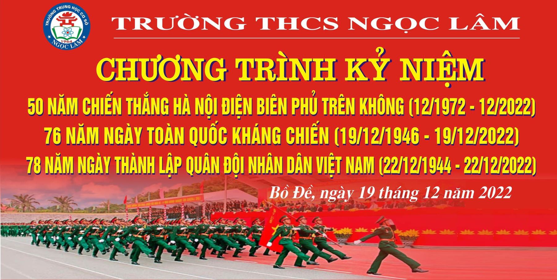 Hướng đến tháng 12 lịch sử, dưới lá cờ quốc kỳ đỏ thắm, học sinh trường THCS Ngọc Lâm cùng nhau ôn lại truyền thống và tự hào về những trang lịch sử hào hùng của dân tộc trong bảo vệ Tổ quốc với những chiến công oanh liệt của quân và dân ta dưới sự lãnh đạo của Đảng Cộng sản Việt Nam.