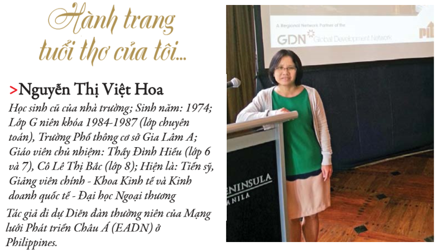 Trong hành trang tuổi thơ của tôi, góc lưu giữ nhiều kỷ niệm đẹp chính là những năm tháng dưới mái trường cấp 2 Gia Lâm A. Ở đây tôi không chỉ được dạy cách say mê học tập, tôi còn được học nhiều bài học làm người, học cách chơi hết mình. Từ đây, tôi có những người thầy giáo, cô giáo đáng kính. Các thầy, các cô luôn là tấm gương để tôi noi theo trong cuộc sống sau này. Cũng từ mái trường này tôi có những người bạn thân như anh em ruột thịt. Cho đến nay, các bạn vẫn luôn là chỗ dựa, động viên, khích lệ và chia sẻ với tôi nhiều vui, buồn trong cuộc sống.