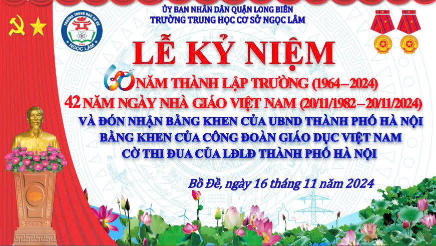 Sinh thời Cố thủ tướng Phạm Văn Đồng đã từng nói: “Nghề dạy học là nghề cao quý nhất trong các nghề cao quý, sáng tạo nhất trong các nghề sáng tạo”. Có thể thấy sứ mạng cao cả mà những người thầy, người cô đang mang trên vai thật lớn lao và xã hội luôn biết ơn, tin tưởng và tôn vinh nghề giáo, tôn vinh những người thầy luôn tâm huyết trong sự nghiệp trồng người. Ngày 16/11/2024, hoà trong không khí tưng bừng của cả nước chào mừng ngày Nhà giáo Việt Nam, được sự cho phép của chi bộ Đảng, Ban giám hiệu nhà trường tổ chức Lễ kỷ niệm 60 năm thành lập trường(1964-2024) - 42 năm ngày nhà giáo Việt Nam 20/11 - đón nhận bằng khen của UBND thành phố Hà Nội, bằng khen của công đoàn giáo dục Việt Nam, cờ thi đua của LĐLĐ thành phố Hà Nội. Đến dự buổi lễ, trường THCS Ngọc Lâm vinh dự được đón tiếp các vị đại biểu, khách quý: