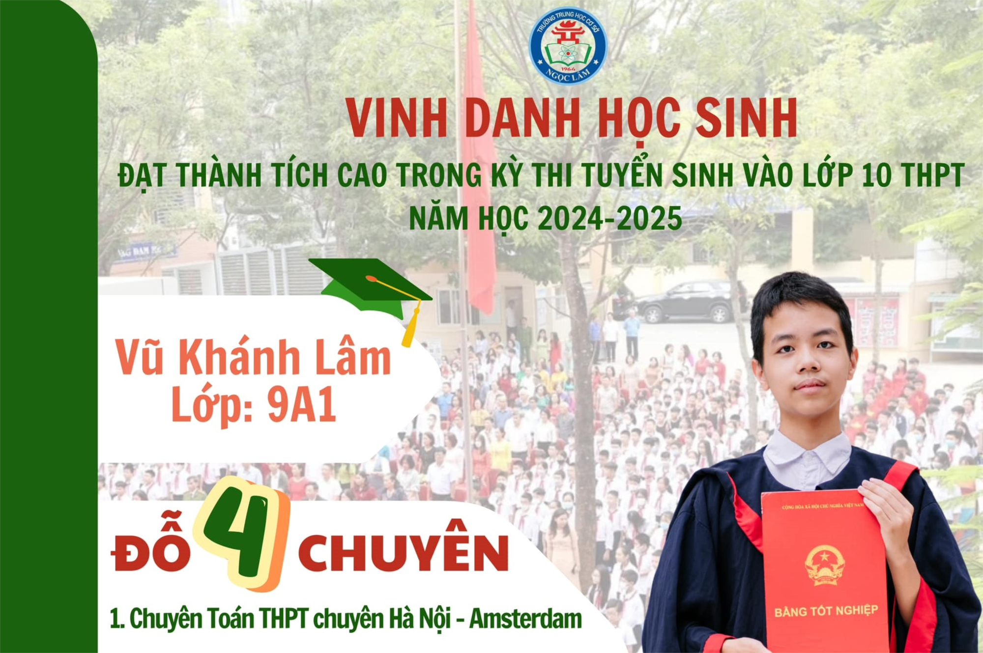 Một người nông dân khi gieo hạt giống xuống đất, họ kì vọng điều gì vào hạt giống đó? Một vụ mùa bội thu? Một mùa màng tươi tốt? Hay đơn giản chỉ là hạt giống ấy lớn lên theo đúng cách mà họ kì vọng? Trên mảnh đất màu mỡ THCS Ngọc Lâm, dưới sự vun trồng tận tụy của những “người nông dân” cần mẫn, ngần ấy hạt giống mỗi ngày vẫn đang dần lớn lên tươi tốt đem cho đời những đóa hoa rực rỡ, ngát hương . Và trong vườn hoa đua sắc ấy, Vũ Khánh lâm – học sinh lớp 9A1 – chính là một bông hoa ngát hương trong vườn hoa THCS Ngọc Lâm. Trong kì thi tuyển sinh vào THPT năm học 2024 - 2025, Vũ Khánh Lâm đã xuất sắc đỗ vào 4 trường chuyên danh tiếng, khẳng định tài năng và sự nỗ lực của mình trong học tập.