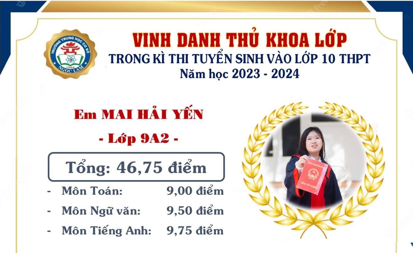 Trên mỗi chuyến xe thanh xuân của tuổi học trò, đặc biệt là trong suốt bốn năm học tập, mỗi bạn học sinh khối 9 đều có cho mình một cột mốc đáng nhớ, ghi dấu chặng đường hoàn thành 9 năm đèn sách, công nhận biết bao cố gắng hết mình của các bạn học sinh cũng như các thầy cô giáo; đồng thời mở ra nhiều cánh cửa mới - đó là kỳ thi tuyển sinh vào lớp 10 THPT . Mỗi năm học trôi qua, những gương mặt trẻ với thành tích học tập đáng nể lại được vinh danh. Và ghi dấu trong bảng vàng thành tích học sinh tiêu biểu trong kì thi vào lớp 10 THPT của trường Trung học Cơ sở Ngọc Lâm lần này là bạn Mai Hải Yến với tổng số điểm xét tuyển là 46.75 điểm. Trong đó: Ngữ Văn : 9,5 điểm; Toán :9,0 điểm; Ngoại Ngữ: 9,75 điểm – Hải Yến đã xuất sắc trở thành thủ khoa của trường Ngọc Lâm trong kỳ thi vào lớp 10 THPT năm học 2023-2024.