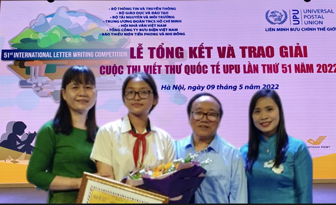 Ngày 9/5/2022 lễ trao giải cuộc thi viết thư UPU lần thứ 51 long trọng được tổ chức tại Trụ sở Tổng công ty Bưu Điện Việt Nam- Số 5 Phạm Hùng- Nam Từ Liêm- TP Hà Nội. Với thành tích 4 năm học THCS đạt danh hiệu học sinh giỏi, với niềm say mê môn Ngữ văn và sự chỉ dẫn của thầy cô, giải thưởng đã giúp em được tuyển thẳng vào trường THPT công lập trong kì thi tuyển sinh vào lớp 10 THPT năm học 2022-2023, giải “ cây bút triển vọng” cũng như một món quà động viên em tiếp tục nhiệt huyết và nuôi dưỡng tình cảm của thế hệ trẻ với xã hội, với thế giới. Em chính là niềm tự hào của gia đình, thầy cô và nhà trường, là tấm gương sáng cho các em học sinh noi theo.