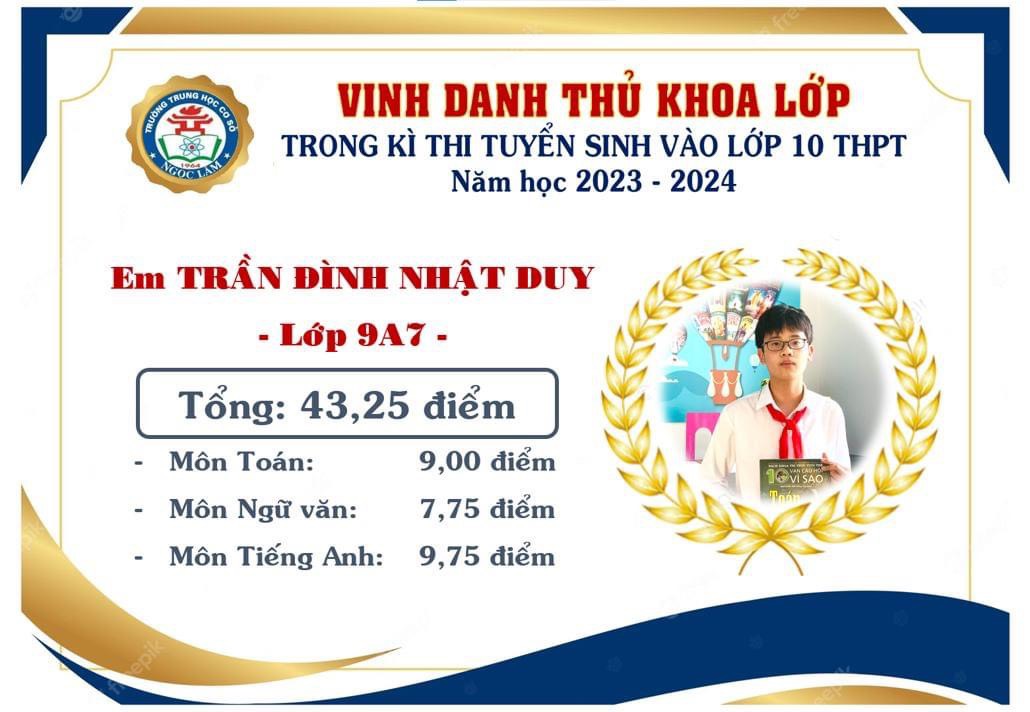 Trần Đình Nhật Duy – Học sinh lớp 9A7 gây ấn tượng với số điểm 43,25 (Tiếng Anh 9,75 điểm, Toán 9 điểm và Văn 7,75 điểm) trong kì thi tuyển sinh vào lớp 10 THPT vừa qua. Với số điểm trên, em đã trở thành thủ khoa của lớp 9A7. Em là niềm tự hào của lớp 9A7, trong suốt 4 năm học em luôn là học sinh xuất sắc của trường, của lớp. Không những vậy, em còn tham gia các kì thi học sinh giỏi của quận, thành phố, các CLB sân chơi như: Bebras, Tin học trẻ, …. và đã đạt giải ba thành phố môn Tin học, giải nhất Tin học trẻ cấp quận.