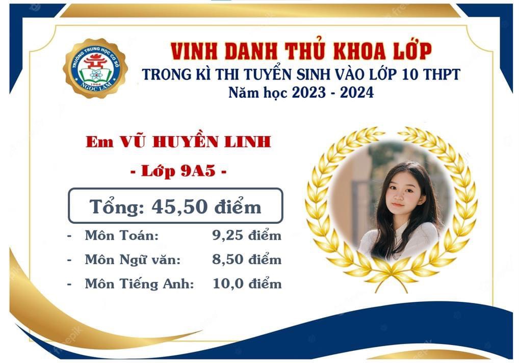 Kỳ thi tuyển sinh vào lớp 10 THPT vừa qua,Vũ Huyền Linh đã đạt tổng điểm xét tuyển là 45.50 điểm và xuất sắc trở thành thủ khoa của lớp 9A5. Trong đó, điểm các môn Toán, Ngữ văn, Tiếng Anh lần lượt là 9.25 điểm; 8.5 điểm và 10 điểm. Huyền Linh cảm thấy rất tự hào và hạnh phúc vì đây là phần thưởng xứng đáng cho công sức và nỗ lực trong suốt 9 năm học tập . Đạt được số điểm này là bạn đã chứng minh được khả năng học tập và kiến thức cũng như niềm say mê học tập của bản thân. Kết quả ấy càng như một động lực thúc đẩy Huyền Linh tiếp tục phấn đấu và học hỏi nhiều thêm trong tương lai.