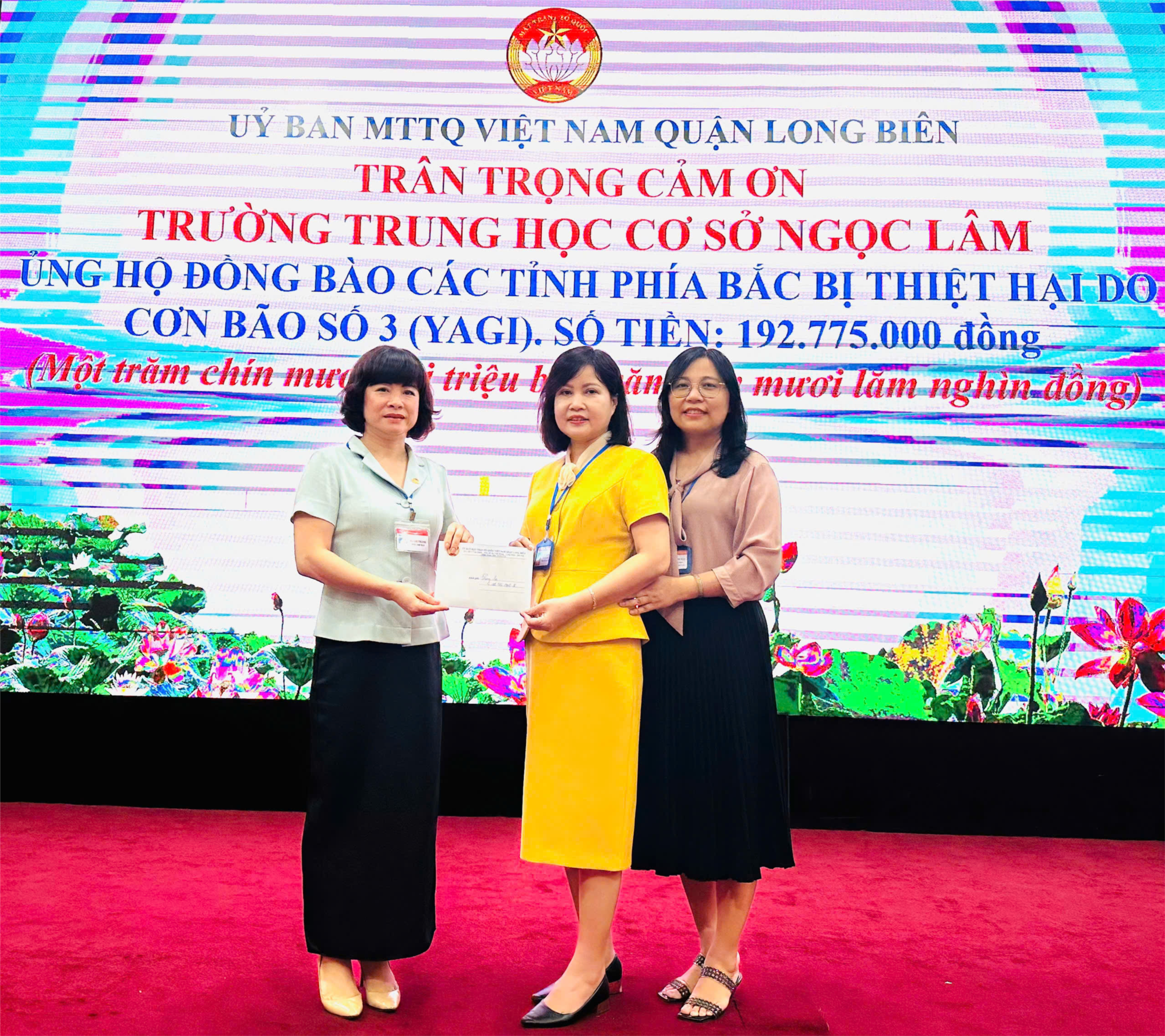 Tình yêu thương được loan tỏa, nhà trường hân hoan đón nhận được rất nhiều tình cảm, chia sẻ từ quý phụ huynh, đại diện học sinh các lớp, từ các cán bộ, giáo viên, nhân viên nhà trường. Sau khi thực hiện kiểm kê, công khai minh bạch số tiền tiếp nhận được tổng là 196.775.000đ. Nhà trường đã trực tiếp bàn giao toàn bộ số tiền ủng hộ về UBMTTQ quận Long Biên để chuyển lên UBMTTQ thành phố Hà Nội phân bổ tới các địa phương bị ảnh hưởng do cơn bão số 3.