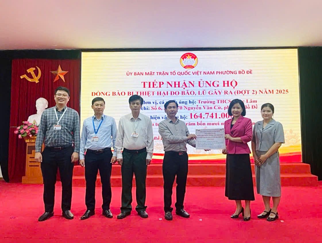 Hưởng ứng lời kêu gọi lần 2 của UBND phường Bồ Đề “Toàn dân ủng hộ đồng bào miền Trung, Tây Nguyên khắc phục hậu quả mưa lũ”, trường THCS Ngọc Lâm đã gửi lời kêu gọi tới toàn thể cán bộ, giáo viên, nhân viên, các bậc phụ huynh và các em học sinh nhà trường phát huy truyền thống nhân ái, cùng sẻ chia, ủng hộ đồng bào bị ảnh hưởng bởi lũ lụt ở miền Trung, Tây Nguyên. Sau một thời gian ngắn phát động, tổng số tiền quyên góp được là 164.741.000 đồng. Số tiền trên đã được đại diện nhà trường chuyển tới UBND phường Bồ Đề.