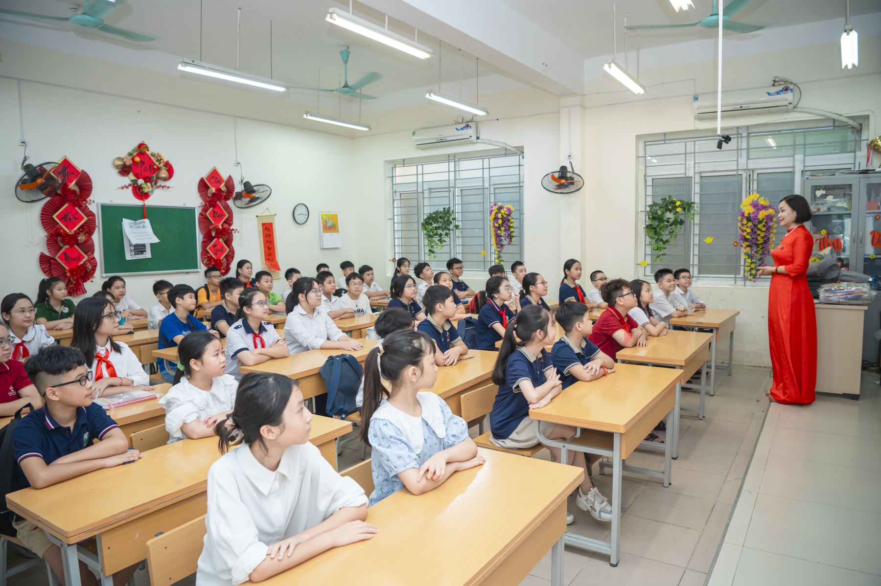 Ngay từ sáng sớm, cánh cổng trường đã được mở ra đón chào Phụ huynh và học sinh lớp 6 thân yêu. Đội ngũ cán bộ nhân viên, các thầy cô giáo trong tà áo dài thướt tha, dịu dàng, ai nấy đều rạng rỡ tươi cười tận tình chỉ dẫn cho học sinh vào vị trí tập trung.