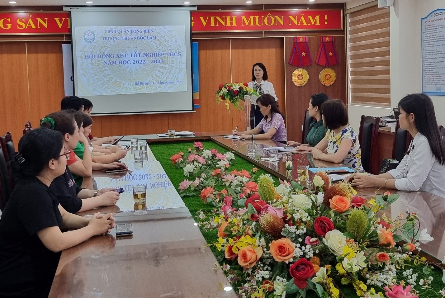 Thực hiện Công văn số 831/ SGDĐT- QLT ngày 23 tháng 3 năm 2023 của Sở GD&ĐT thành phố Hà Nội về việc Hướng dẫn xét công nhận tốt nghiệp THCS năm học 2022-2023; Thực hiện Công văn số 90/ PGDĐT ngày 07 tháng 04 năm 2023 của Phòng GD&ĐT quận Long Biên về việc Hướng dẫn xét công nhận tốt nghiệp THCS năm học 2022-2023; Buổi sáng ngày 11/5/2023 tại trường THCS Ngọc Lâm đã thực hiện việc xét công nhận tốt nghiệp THCS năm học 2022-2023. Năm học 2022-2023 nhà trường có 7 lớp khối 9 với 365 học sinh. Theo kế hoạch của nhà trường, các đồng chí GVCN và GVBM đã hoàn thành chương trình học, hoàn thiện điểm, đánh giá xếp loại cuối năm cho học sinh lớp 9 niên khoá 2019-2023 để có đầy đủ hồ sơ xét tốt nghiệp cho các em.