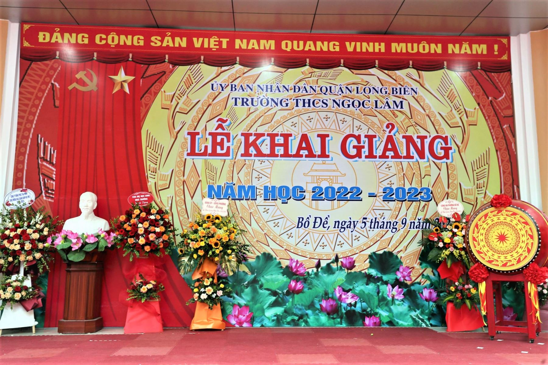 Sáng ngày 5/9, Lễ khai giảng năm học 2022-2023 của trường THCS Ngọc Lâm đã diễn ra vừa trang trọng vừa đầy hứng khởi. Đến dự với buổi lễ khai giảng có bà Nguyễn Thị Thanh Hằng-Quận ủy viên, Bí thư Đảng ủy phường Bồ Đề, ông Hoàng Văn Đông- Phó trưởng công an phường Bồ Đề, bà Trần Thị Kim Phượng, Đảng ủy viên, Chủ tịch hội phụ nữ phường Bồ Đề; các bác là lãnh đạo, phụ trách trưởng các đoàn thể Mặt trận Tổ quốc, Hội Cựu chiến binh, Hội chữ thập đỏ, Công an phường, Hội phụ nữ, tổ dân phố, Đoàn thanh niên phường Bồ Đề, cùng đại diện của Công ty xây dựng 749. Nhà trường vui mừng được đón các bác Nguyễn Thái Bình, trưởng ban đại diện cha mẹ học sinh nhà trường, bác Đỗ Trúc Quỳnh- phó ban đại diện cha mẹ học sinh nhà trường và các bác đại diện phụ huynh các lớp tới tham dự lễ khai giảng. Về phía nhà trường có sự hiện diện của nhà giáo ưu tú Ngô Hồng Giang - Bí thư chi bộ, Hiệu trưởng nhà trường; nhà giáo Nguyễn Thị Thu Hằng – Phí bí thư chi bộ, Phó hiệu trưởng; nhà giáo Nguyễn Ngọc Lan, Phó hiệu trưởng cùng toàn thể thầy giáo, cô giáo, cán bộ nhân viên và các em học sinh nhà trường.