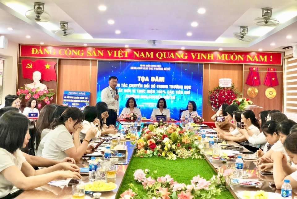 Mở đầu buổi tọa đàm đồng chí Nguyễn Thu Huyền - Hiệu trưởng trường TH Ngọc Lâm đã thông qua báo cáo đề dẫn về việc thực hiện chuyển đổi số trong các nhà trường thuộc khối giáo dục phường Bồ Đề. Đồng chí thông qua đặc điểm tình hình khối giáo dục phường Bồ Đề gồm 6 trường công lập có những thuận lợi nhất định như; Được sự quan tâm của các cấp lãnh đạo, đầu tư CSVC, trang thiết bị dạy học, sự phối hợp của các nhà trường và đạt kết quả cao được các cấp ghi nhận, khen tặng. Tuy nhiên một số trường học gặp khó khăn khi trang thiết bị đã xuống cấp, hao mòn trong quá trình sử dụng, hạn chế trong cập nhật các phần mềm mới. Một số giáo viên cao tuổi còn hạn chế trong sử dụng, ứng dụng thiết bị phương pháp dạy học, một số phụ huynh chưa thực sự ủng hộ công tác giáo dục trong nhà trường. Đồng chí triển khai các văn bản chỉ đạo về công tác chuyển đổi số, ứng dụng công nghệ thông tin, chủ đề công tác năm 2024 của quận. Ghi nhận những kết quả đã đạt được của các nhà trường trong thời gian qua.