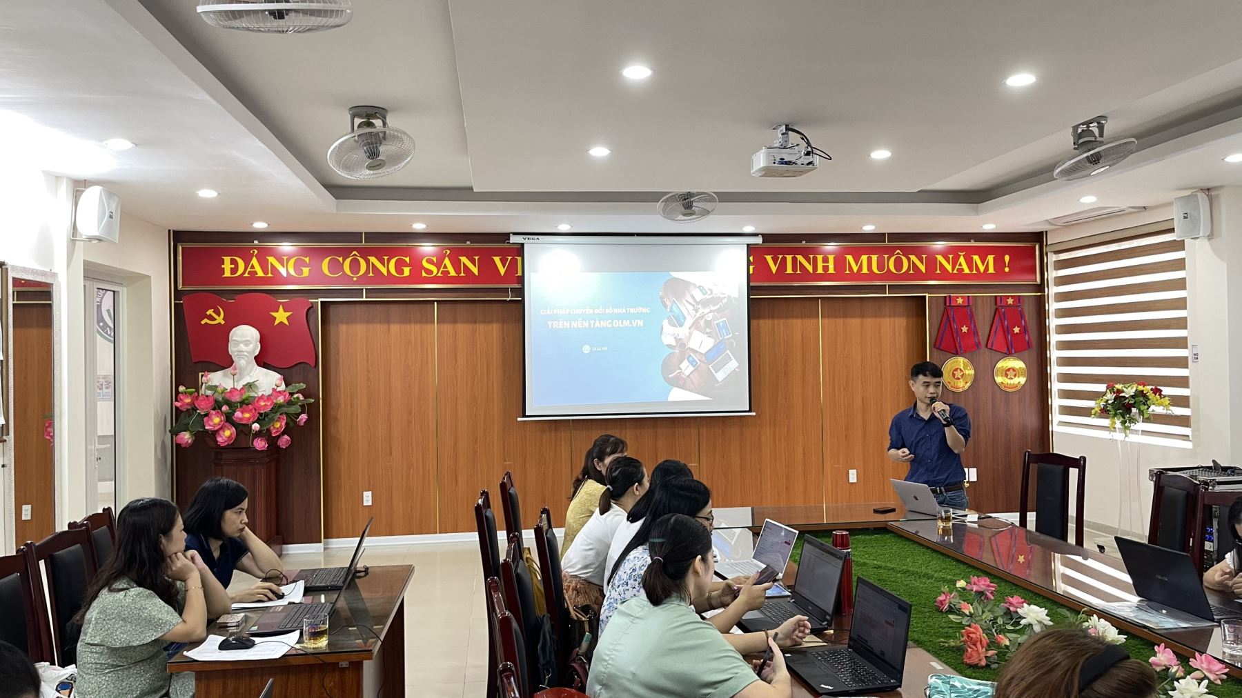Trong buổi tập huấn sử dụng phần mềm OLM, nhà trường mời thầy giáo Hà Đức Thọ - chuyên viên phụ trách trang Web đến hướng dẫn cán bộ, giáo viên các kĩ năng liên quan đến quản lý và dạy học trực tuyến như: quản lý danh sách lớp học, các khóa học trên OLM, học liệu các môn học trên OLM, cách tạo file đề kiểm tra cũng như trộn đề kiểm tra.. Thầy Đức Thọ cũng chia sẻ những thông tin rất hữu ích về cách khai thác dữ liệu, sử dụng dữ liệu trên OLM của tất cả các môn học trong giai đoạn thay đổi SGK theo chương trình giáo dục phổ thông 2018. Bên cạnh đó, ở phần mềm này, thầy/cô giáo có thể dễ dàng giao thêm bài tập cho học sinh và kiểm soát tiến độ làm bài của học sinh. Đối với học sinh, các em có thể dễ dàng tìm thấy dữ liệu bài học, các video giới thiệu môn học, bài học; các file đề kiểm tra thầy cô giáo giao...