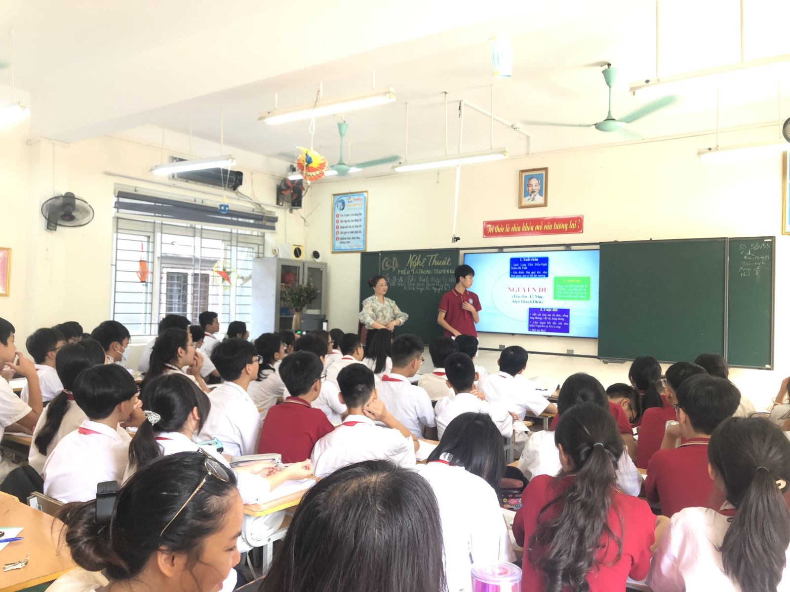 Trong giờ Ngữ văn tại lớp 9A5, ở tiết 1 của bài học, cô giáo Hán Thu Huyền đã cho học sinh trình bày nhiệm vụ được phân công về tác giả, tác phẩm, phong cách sáng tác của tác giả Nguyễn Du cùng đoạn trích “Chị em Thúy Kiều”. Trong bài học, cô đã hướng dẫn học sinh tìm hiểu về nghệ thuật miêu tả nhân vật thông qua đoạn trích “Chị em Thúy Kiều.” Qua bài dạy, học sinh không chỉ nhận biết được về thể loại thơ, về thủ pháp nghệ thuật mà còn được rèn các kĩ năng, thái độ - nghiêm túc, tự giác trong học tập; có ý thức và thái độ chủ động, tự giác và hợp tác trong học tập.