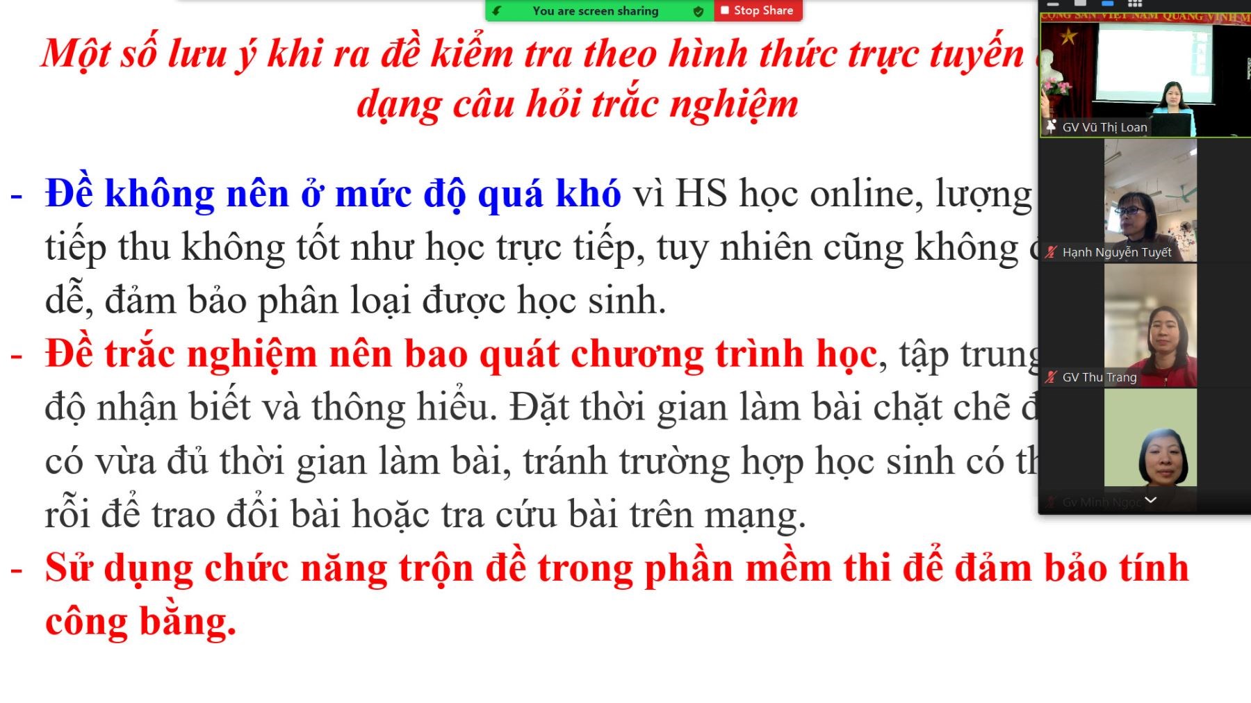 Dưới sự chỉ đạo sát sao của Ban giám hiệu nhà trường, sự vào cuộc tích cực của các thầy cô giáo, các tổ nhóm chuyên môn đã tích cực tham gia thảo luận về việc xây dựng đề kiểm tra, các kĩ thuật ra đề kiểm tra theo hình thức trực tuyến và sử dụng các phần mềm hỗ trợ kiểm tra trực tuyến, đã nêu rõ những khó khăn, vướng mắc trong quá trình xây dựng, thiết kế đề kiểm tra trực tuyến. Các đồng chí trong Ban giám hiệu nhà trường đã tiếp nhận những vướng mắc ấy và giải đáp cho các tổ nhóm chuyên môn. Sau phần thảo luận của các tổ nhóm,