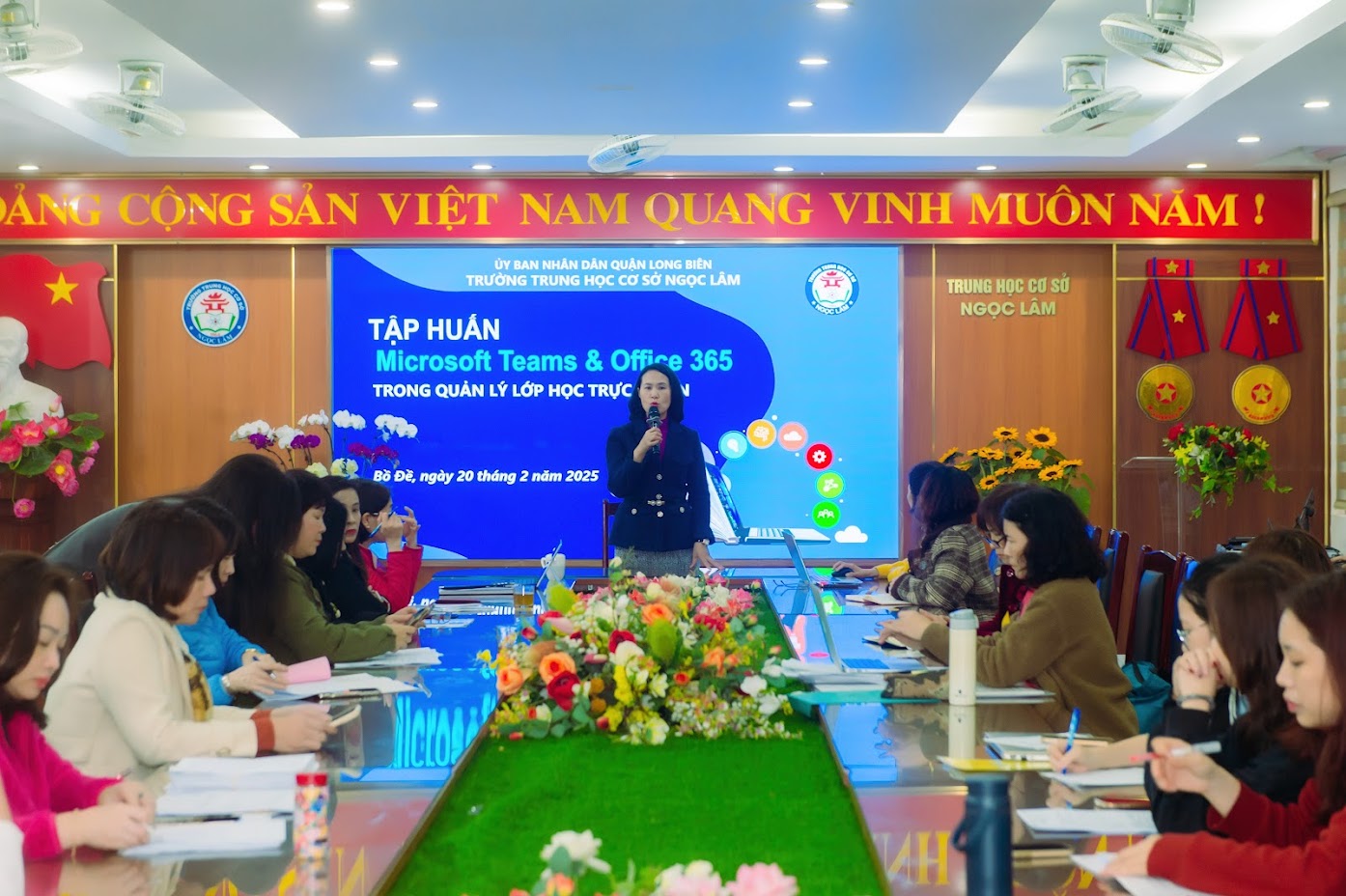 Hiện nay, Microsoft Teams là một trong những công cụ hỗ trợ giảng dạy và làm việc trực tuyến hiệu quả nhất. Với khả năng tổ chức lớp học, chia sẻ tài liệu, giao tiếp trực tuyến và quản lý học tập, Microsoft Teams giúp giáo viên và học sinh tương tác một cách linh hoạt và hiệu quả. Chính vì thế, BGH trường THCS Ngọc Lâm đã lựa chọn phần mềm này để tập huấn cho các thầy cô giáo trong công tác quản lí lớp học trực tuyến.