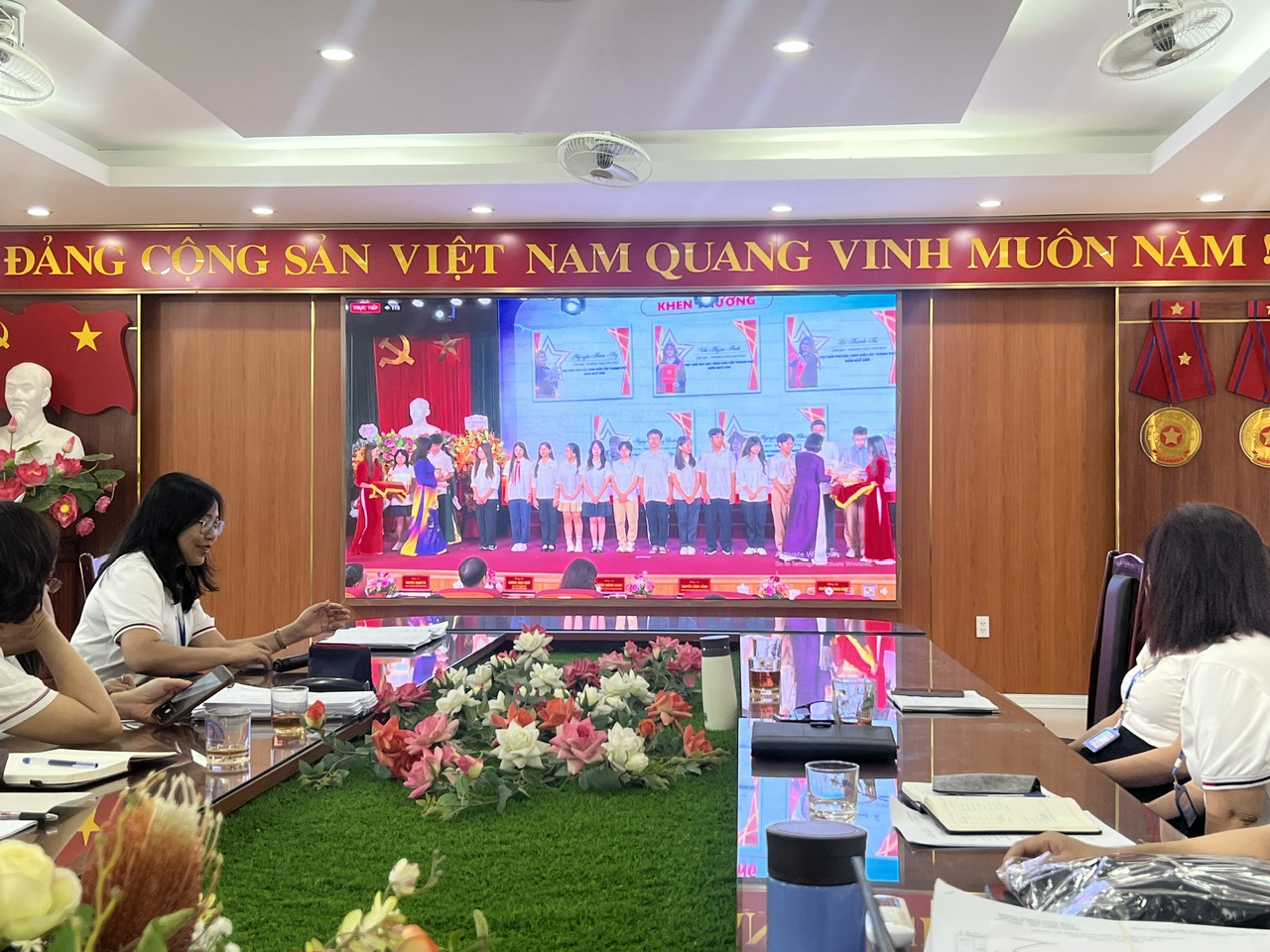 Tại phòng Hội đồng sư phạm nhà trường, tập thể thầy cô giáo, các bậc phụ huynh và các em học sinh tiêu biểu đã nghiêm túc theo dõi hội nghị. Đồng thời, nhà trường đã tổ chức tuyên dương, khen thưởng các em học sinh có thành tích xuất sắc trong năm học 2023- 2024 vừa qua. Với những điều đã đạt được, chúc tập thể nhà trường, các thầy cô giáo, các em học sinh tiếp tục nỗ lực phấn đấu để gặt hái nhiều thành tích trong năm học 2024- 2025 sắp tới.