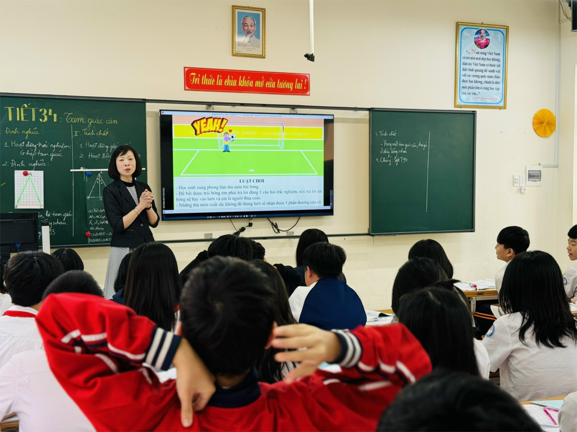 Với tâm huyết và sự đam mê với nghề, tiết chuyên đề của cô giáo Trần Minh Ngọc không chỉ là việc truyền đạt kiến thức mà còn là một hành trình khám phá về các khái niệm, tính chất của tam giác cân. Thay vì phương pháp truyền thống, cô giáo đã dạy học theo định hướng phát triển năng lực để kích thích sự tò mò và sáng tạo của các em học sinh. Trong tiết học, các em học sinh đã chủ động, tích cực tham gia các hoạt động dưới sự hướng dẫn của cô giáo và đặc biệt các em còn được tham gia vào các hoạt động thực hành như ghép ống hút, gấp giấy để xây dựng các mô hình tam giác cân. Việc này không chỉ giúp học sinh hiểu sâu về cấu tạo của tam giác mà còn phát triển kỹ năng tư duy không gian và sáng tạo. Ngoài ra, việc sử dụng các đồ dùng dạy học trực quan kết hợp với ứng dụng hiệu quả công nghệ thông tin đã tạo được sự hứng thú cho học sinh trong việc tiếp thu kiến thức cũng như vận dụng kiến thức đã học vào thực tế.