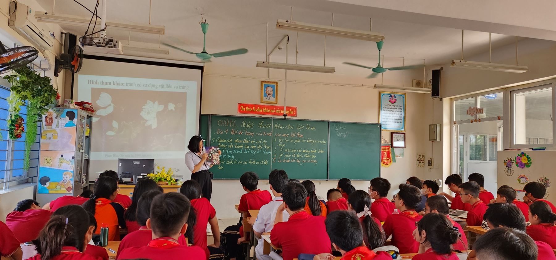 Đến tham dự và chỉ đạo chuyên đề có các đồng chí trong Ban giám hiệu cùng toàn thể giáo viên tổ Anh- Năng khiếu. Các thầy cô giáo được dự tiết Nghệ thuật lớp 8 với nội dung: “ Nghệ thuật hiện đại Việt Nam- Bài 4: Nét đặc trưng trong tranh sơn mài Việt Nam”. Tiết dạy do cô giáo Vũ Thị Hương Giang thực hiện tại lớp 8A1.