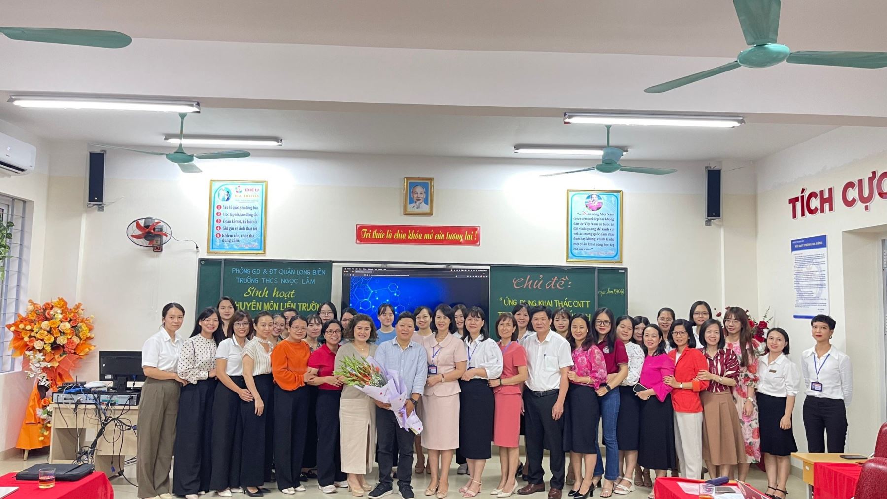 Ngày nay, cùng với sự hội nhập toàn cầu, việc tăng cường năng lực ngoại ngữ nói chung và tiếng Anh nói riêng luôn được quan tâm ở mọi cấp học trong hệ thống giáo dục quốc dân. Để đạt được mục tiêu trên, nhiều phương pháp giảng dạy tiếng Anh được cải tiến và áp dụng. Trong đó, việc ứng dụng công nghệ thông tin (CNTT) được coi là xu thế tất yếu và là một biện pháp hiệu quả trong việc thực hiện chương trình GDPT 2018. Căn cứ nhiệm vụ năm học 2023- 2024 của Phòng giáo dục và đào tạo quận Long Biên; thực hiện nhiệm vụ năm học 2023- 2024 của trường THCS Ngọc Lâm trong buổi chiều ngày 24/10/2023, trường THCS Ngọc Lâm thực hiện sinh hoạt chuyên đề liên trường với chủ đề: “Ứng dụng, khai thác CNTT trong giảng dạy tiếng Anh tại các trường THCS”
