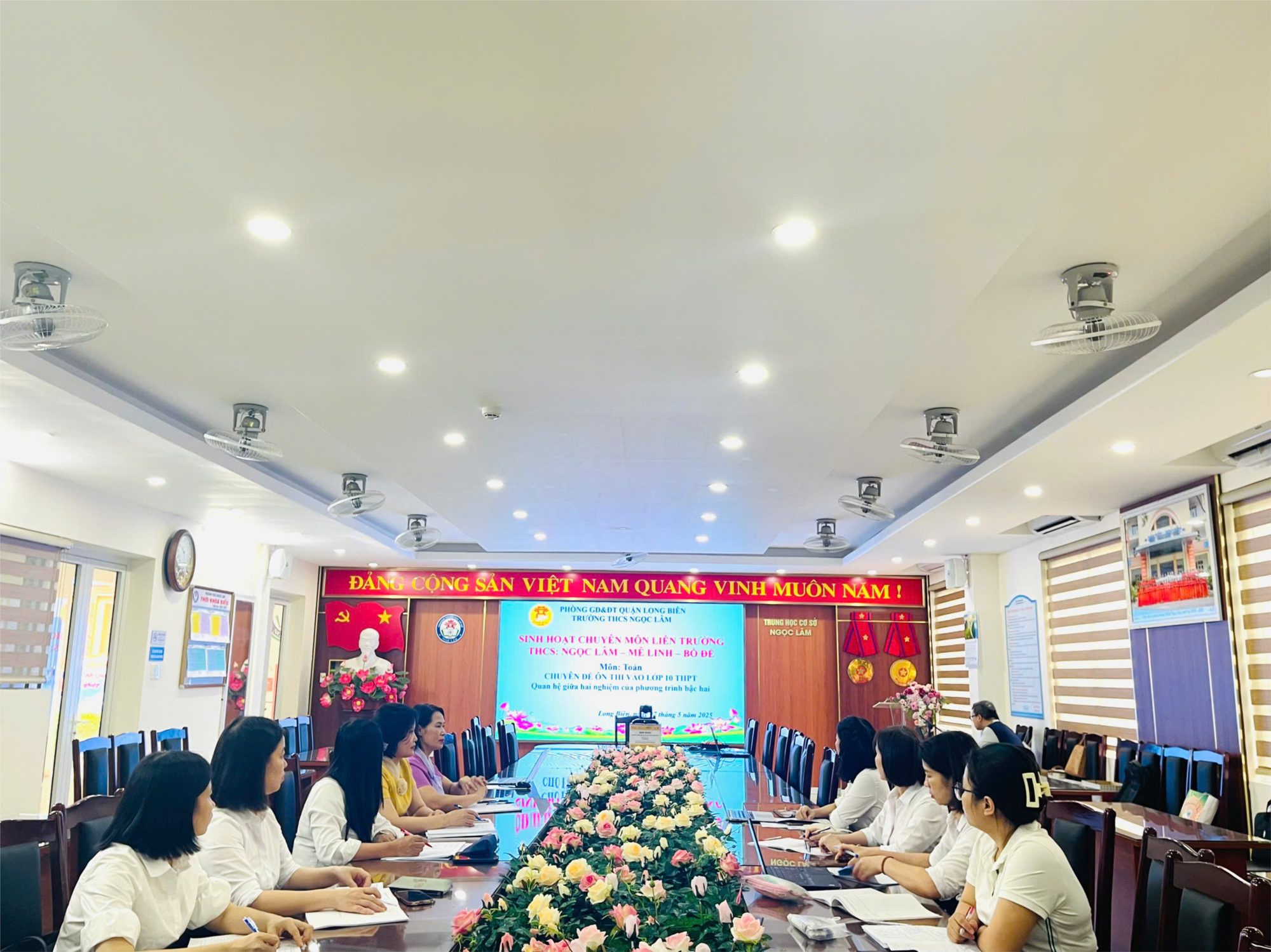 Căn cứ nhiệm vụ năm học 2024 - 2025 của Phòng giáo dục và đào tạo quận Long Biên; thực hiện nhiệm vụ năm học 2024 - 2025 của trường THCS Ngọc Lâm, trong buổi chiều ngày 7/5/2025, tại trường THCS Ngọc Lâm, BGH nhà trường đã tổ chức buổi sinh hoạt chuyên môn liên trường với chuyên đề ôn thi vào lớp 10 THPT: “Quan hệ giữa hai nghiệm của phương trình bậc 2”.
