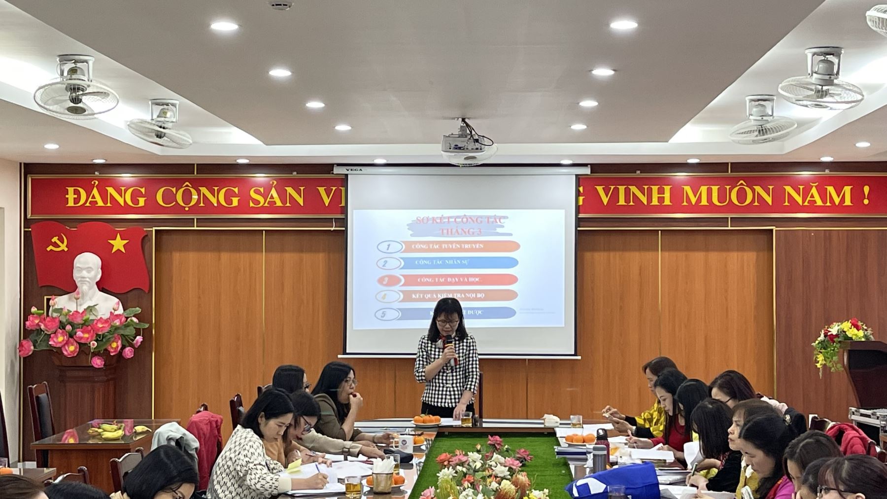 Trong cuộc họp này, nhà giáo Ngô Hồng Giang - Bí thư Chi bộ - hiệu trưởng nhà trường đã điểm lại những hoạt động chính trong tháng 3 như: công tác nhân sự; tình hình học sinh; công tác dạy và học; hoạt động công đoàn; một số thành tích của giáo viên và học sinh trong học kỳ II; các hoạt động đội và ngoài giờ lên lớp; hoạt động khác như công tác phòng chống dịch bệnh, công tác y tế.