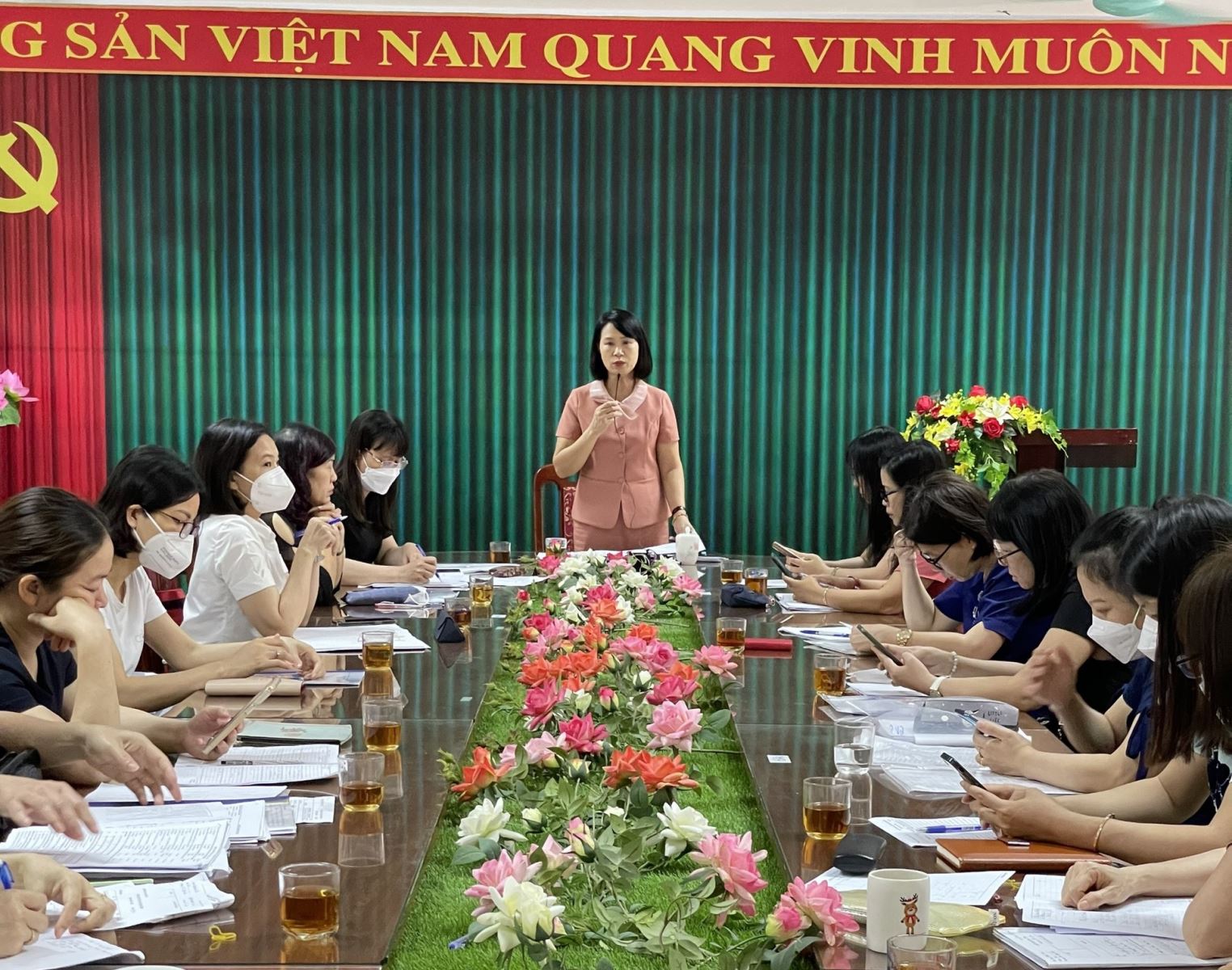 Đồng chí Ngô Hồng Giang- Hiệu trưởng nhà trường đọc quyết định thành lập Hội đồng xét tốt nghiệp. Tiếp theo là đồng chí Nguyễn Ngọc Lan - Phó hiệu trưởng đọc danh sách học sinh được xét tốt nghiệp THCS. Cuối cùng các đ/c GVCN cùng bộ phận văn phòng rà soát học lực và hạnh kiểm của từng học sinh của từng lớp.