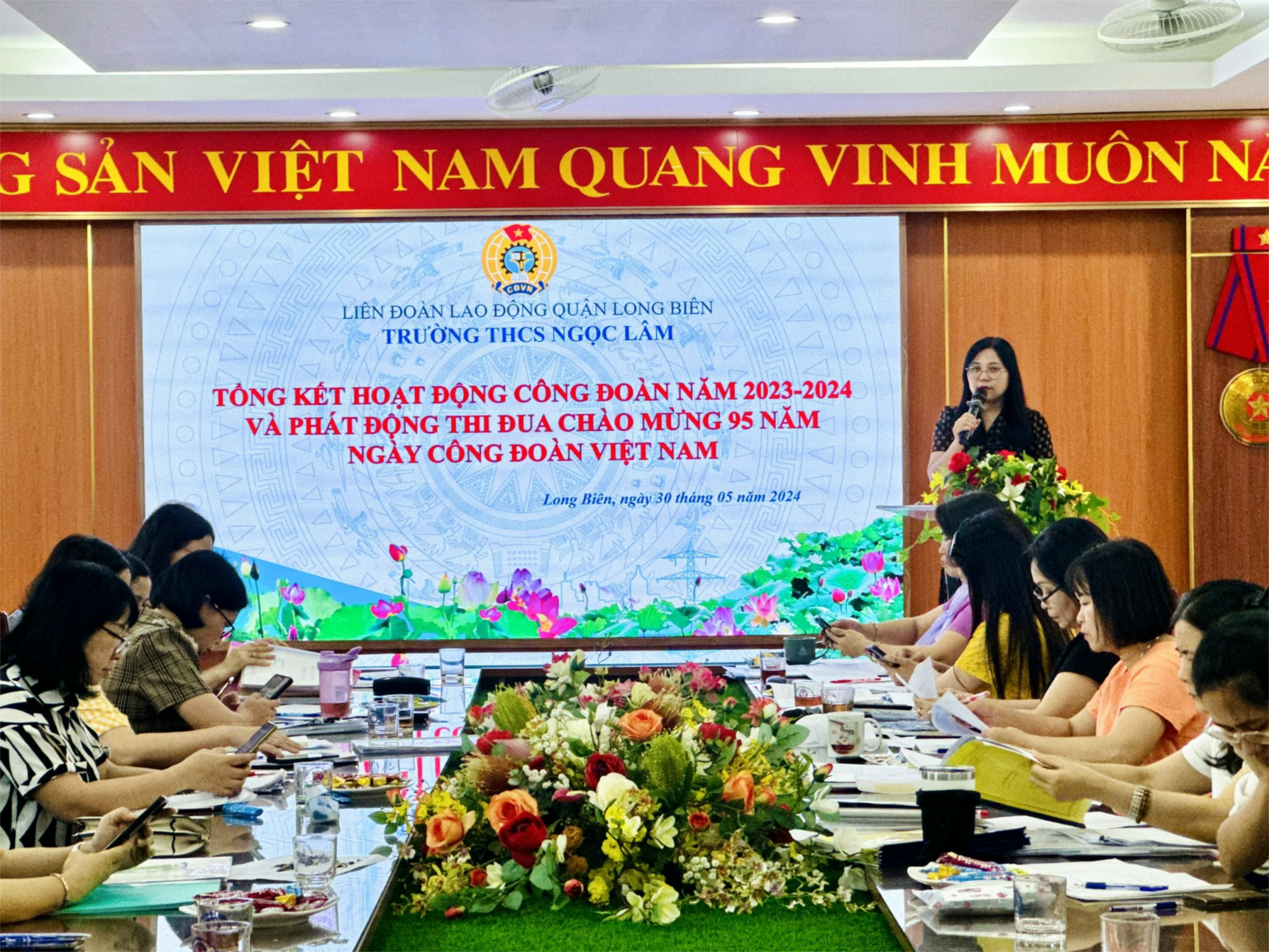 Tại hội nghị, đồng chí Nguyễn Thị Mai, chủ tịch công đoàn nhà trường đã đánh giá cụ thể những kết quả công đoàn nhà trường đã đạt được trong năm học 2023- 2024, biểu dương sự nỗ lực, quyết tâm của đoàn viên công đoàn trong các phong trào thi đua. Trong năm học vừa qua, công đoàn nhà trường đã tích cực tham gia các cuộc thi, các hoạt động do LĐLĐ quận tổ chức. Công đoàn đã tham gia ngày hội văn hóa TDTT cho công nhân viên chức lao động tổ chức,phối hợp cùng nhà trường tổ chức thành công lễ khai giảng năm học 2023-2024. Tổ chức khai trương Góc chill có mời LĐLĐ về dự. Công đoàn tham gia đầy đủ các hoạt động chào mừng 20 năm TL quận Long Biên.Tham dự Giọng hát hay Long Biên và đã đạt giải Ba cấp quận,công đoàn phối hợp cùng nhà trường tổ chức thành công lễ kỉ niệm ngày nhà giáo VN 20/11.Tham gia đầy đủ các cuộc thi trực tuyến, trực tiếp do LĐLĐ phát động như: Duyên dáng áo dài,giải bóng chuyền hơi và rất nhiều các cuộc thi khác.Bên cạnh đó công đoàn cũng rất quan tâm đến công tác chăm lo đời sống cho công đoàn viên, cụ thể các hoạt động mà CĐ đã làm được .Tổ chức gặp mặt vui tết trung thu cho các cháu thiếu nhi và tặng quà HSG, HSTT, đỗ THPT, đỗ đại học cho các cháu là con của CB GVNV trong nhà trường.Tặng bánh trung thu nhân dịp rằm tháng 8 cho các công đoàn viên.Tổ chức kỉ niệm ngày Phụ nữ VN 20/10.Chuẩn bị quà tết nguyên đán cho các đ.c công đoàn viên trong nhà trường. Tổ chức gặp mặt, giao lưu chúc mừng năm mới trước khi nghỉ tết. Tặng quà cho tứ thân phụ mẫu của các đ.c công đoàn viên tuổi từ 80 trở lên. Tặng quà cho GV có hoàn cảnh khó khăn nhân dịp tết nguyên đán.Tổ chức thành công lễ kỉ niệm ngày quốc tế phụ nữ 8/3.Tổ chức đi du xuân đầu năm.Công đoàn hỏi thăm tặng quà cho các đ.c ốm đau, thai sản, cho thân nhân các đ.c công đoàn viên đi viện điều trị.Tặng quà cho các cháu thiếu nhi nhân dịp tết Thiếu nhi 1.6. Tổ chức gặp mặt kỉ niệm ngày thương binh liệt sĩ 27/7 và tặng quà cho các đ.c công đoàn viên có thân nhân là thương binh, liệt sĩ. Thành lập CLB yoga, bóng chuyền hơi tập luyện nâng cao sức khỏe. Cùng nhà trường tổ chức thành công chuyến du lịch hè Huế Lăng Cô để lại nhiều kỉ niệm khó quên .Tổ chức thành công Ngày hội gia đình . Những thành tích mà công đoàn nhà trường đạt được cho thấy sự nỗ lực, trách nhiệm và không ngừng đổi mới, sáng tạo của Ban Chấp hành Công đoàn nhà trường; sự quan tâm, ủng hộ của Ban Giám hiệu nhà trường; cũng như sự đoàn kết, nhất trí vươn lên của mỗi đoàn viên công đoàn nhà trường.