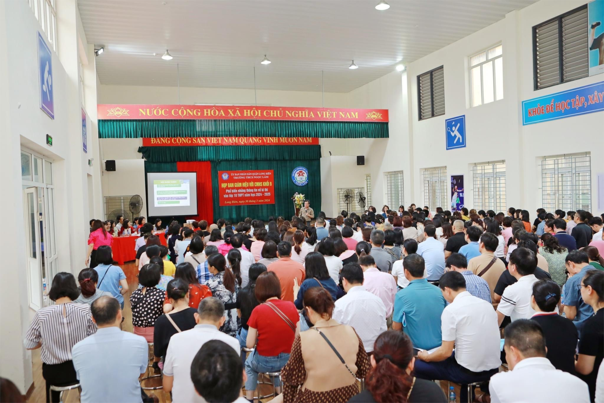 Trước buổi họp, nhà trường đã mời chuyên gia tâm lý: PGS, Tiến sĩ Phạm Văn Tư đến từ trường ĐHSP Hà Nội về để trao đổi với PHHS K9 về việc: Tạo động lực cho con trước kì thi. Tiếp đó, cô Ngô Hồng Giang- Hiệu trưởng nhà trường đã báo cáo với PHHS khối 9 những thông tin quan trọng về kì thi THPT vào lớp 10 năm học 2024 - 2025 và công tác dạy và học của nhà trường đối với học sinh khối 9 của trường THCS Ngọc Lâm.