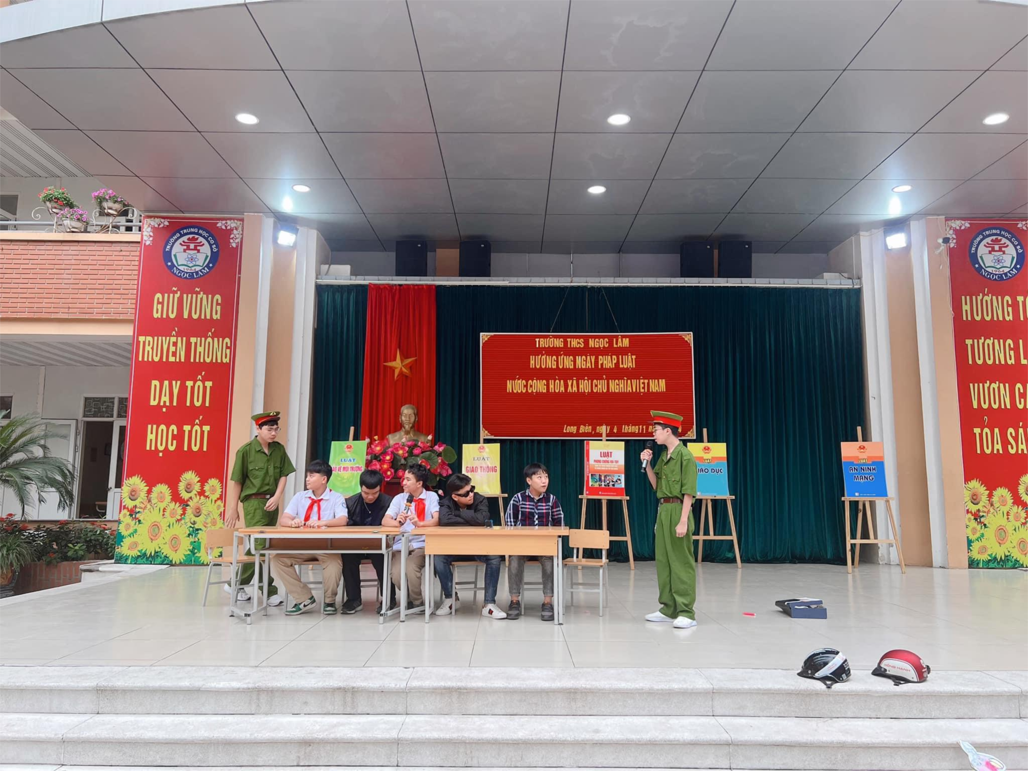 Trong buổi tuyên truyền, các em học sinh lớp 8A6 đã mang đến những tiểu phẩm đặc sắc, góp phần truyền tải những thông điệp về Luật an toàn giao thông, nhắc nhở các em học sinh tuân thủ luật giao thông, đặc biệt là luôn đội mũ bảo hiểm khi điều khiển xe đạp điện, xe máy điện hay khi ngồi sau xe máy; về quy định xử phạt với vi phạm quy định về bán, cung cấp thuốc lá, trong đó có thuốc lá điện tử. Dưới sự biểu diễn tự tin, hài hước của các em học sinh lớp 8A6, những kiến thức pháp luật khô khan đã được truyền tải tới toàn thể học sinh nhà trường một cách sinh động và dễ nhớ. Để từ đó, các em học sinh có ý thức tìm hiểu và thực hiện đúng theo các quy định, điều luật, pháp luật của Nhà nước. Ngoài ra, các em học sinh cũng được tìm hiểu thêm về những tác hại của thuốc lá, đặc biệt là thuốc lá điện tử đối với sức khỏe thể chất và tinh thần của các em. Chương trình sinh hoạt dưới cờ khép lại với các tiết mục văn nghệ sôi động và ý nghĩa.