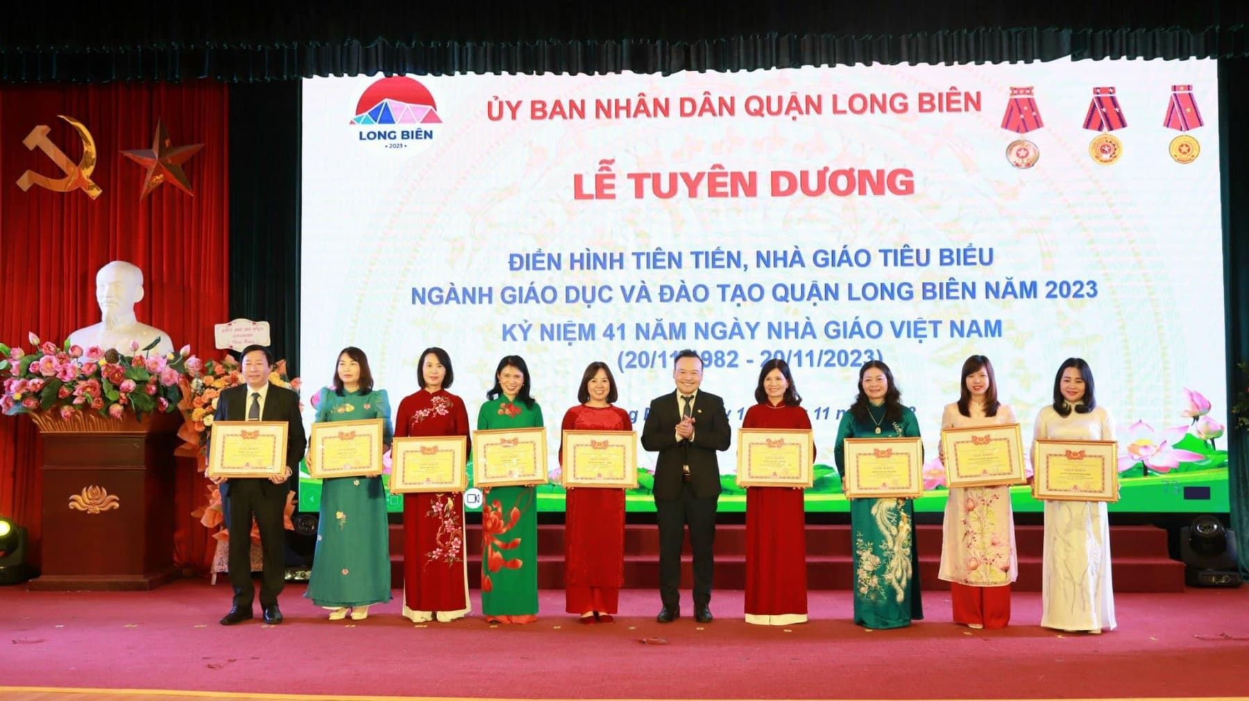 Suốt hành trình cống hiến không biết mệt mỏi nhiều năm qua, Nhà giáo ưu tú Ngô Hồng Giang đã lan tỏa tinh thần đổi mới, sáng tạo trong quản lý, giảng dạy tới nhiều giáo viên, trường học trên địa bàn quận Long Biên. Để ghi nhận những đóng góp đó sáng ngày 16/11/2024 tại lễ tuyên dương khen thưởng điển hình tiên tiến, nhà giáo tiêu biểu ngành Giáo dục và Đào tạo quận Long Biên, chào mừng kỉ niệm 41 năm ngày Nhà giáo Việt Nam, Nhà giáo ưu tú Ngô Hồng Giang vinh dự được nhận bằng khen của Bộ trưởng bộ GD và ĐT vì đã có thành tích tiêu biểu, xuất sắc trong phong trào thi đua “Đổi mới, sáng tạo trong quản lý, giảng dạy và học tập” năm học. 2022-2023
